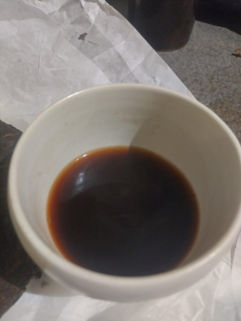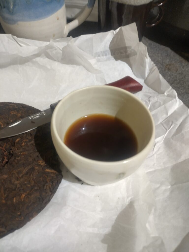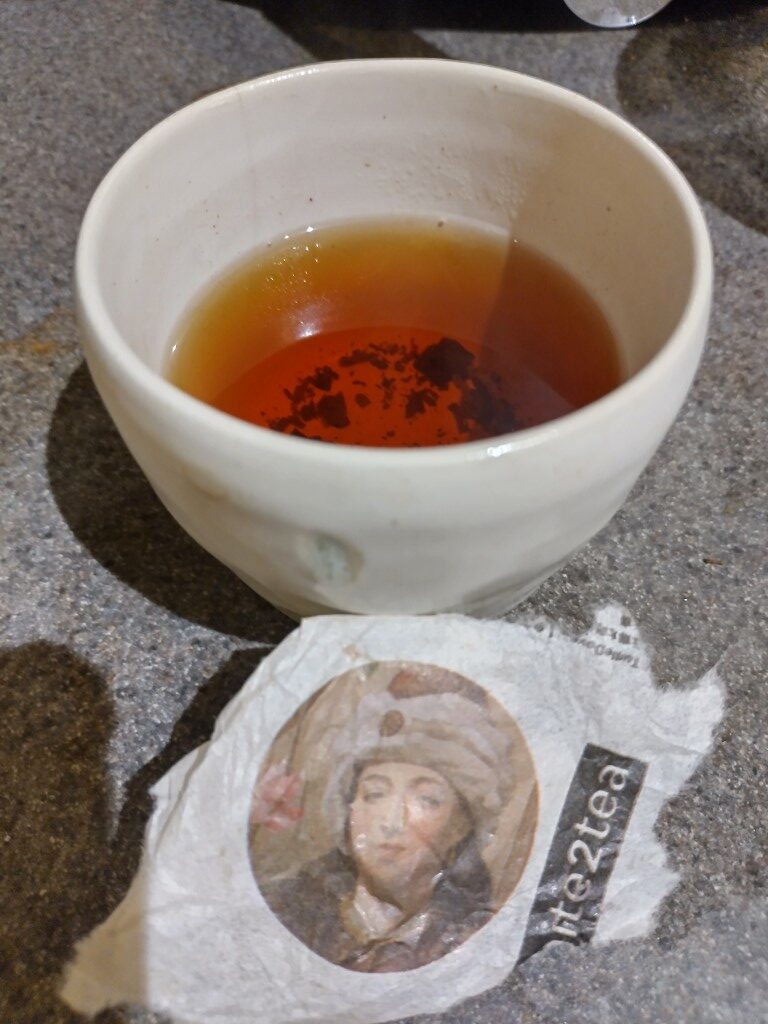 Nice interesting floral note, a light sweetness, flavour becomes mild herbal wheatgrass, I thought there was some light bitterness on the 5th steep, maybe? (5x5sec), light barley tea, slight vegetal sweetness on the 6th steep, it just keeps going, lightly on. This was one of two samples with a cake of 2025 Lào Cai white tea. From Viet Sun.