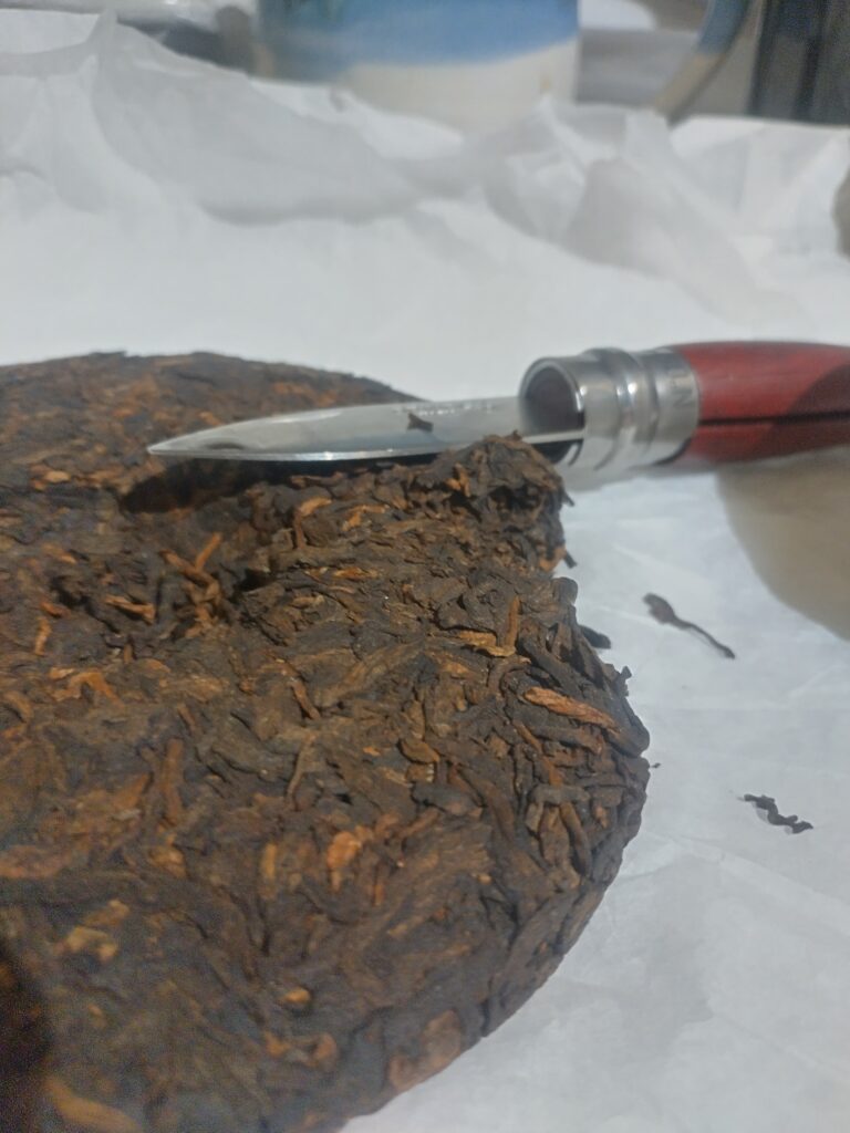 I break up my tea, trying to keep as much leaf shape as possible, leaving any “chunks” that will only result in flakes, and store it in containers for use on my counter. I do this to half of a cake and then store the other still intact half in a mylar bag with a boveda in a container in a location with relatively stable temperature, this keeps the tea at approx 72%RH and approx 23-26C. If the tea is good for aging and I like it enough I’ll rebuy it for long term storage to replace the half.