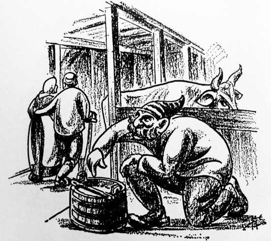 Hiding in the stalls, he would steal the milk, while the milkmaid gave the cowherd a meaningful smile
