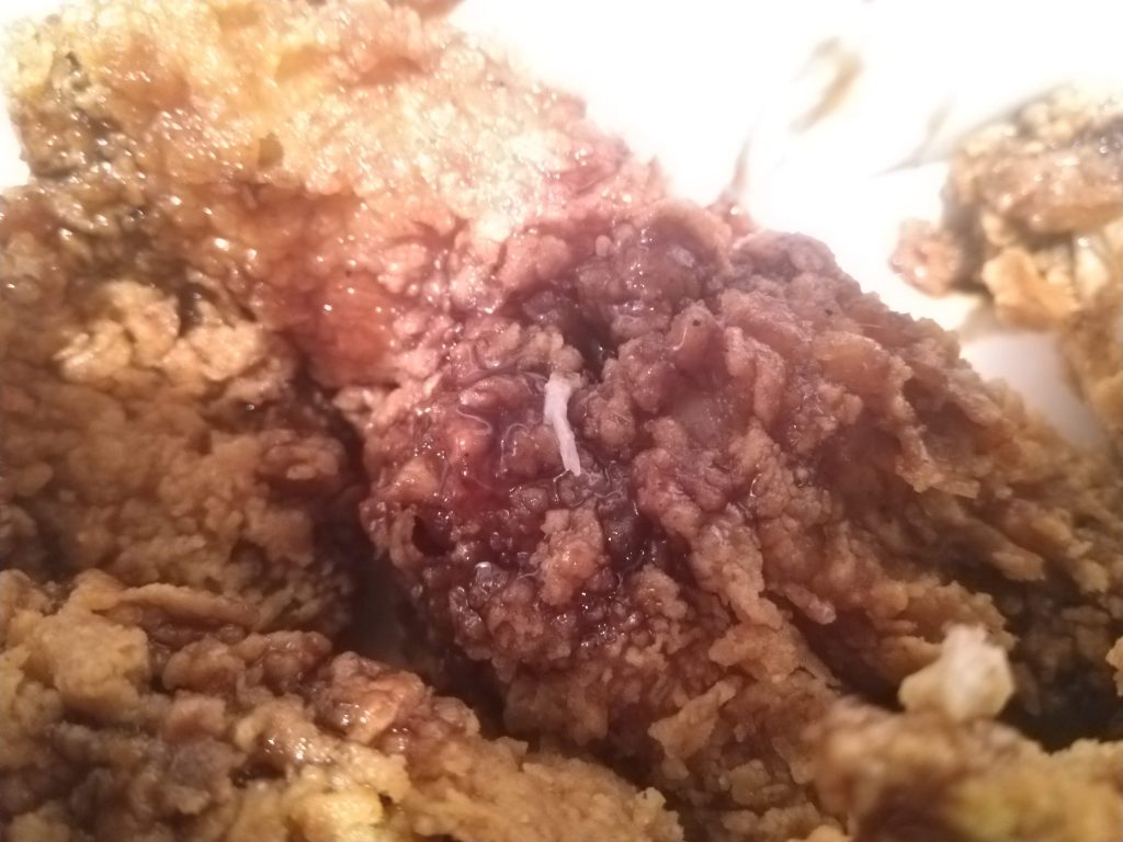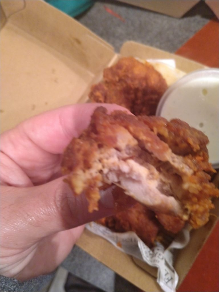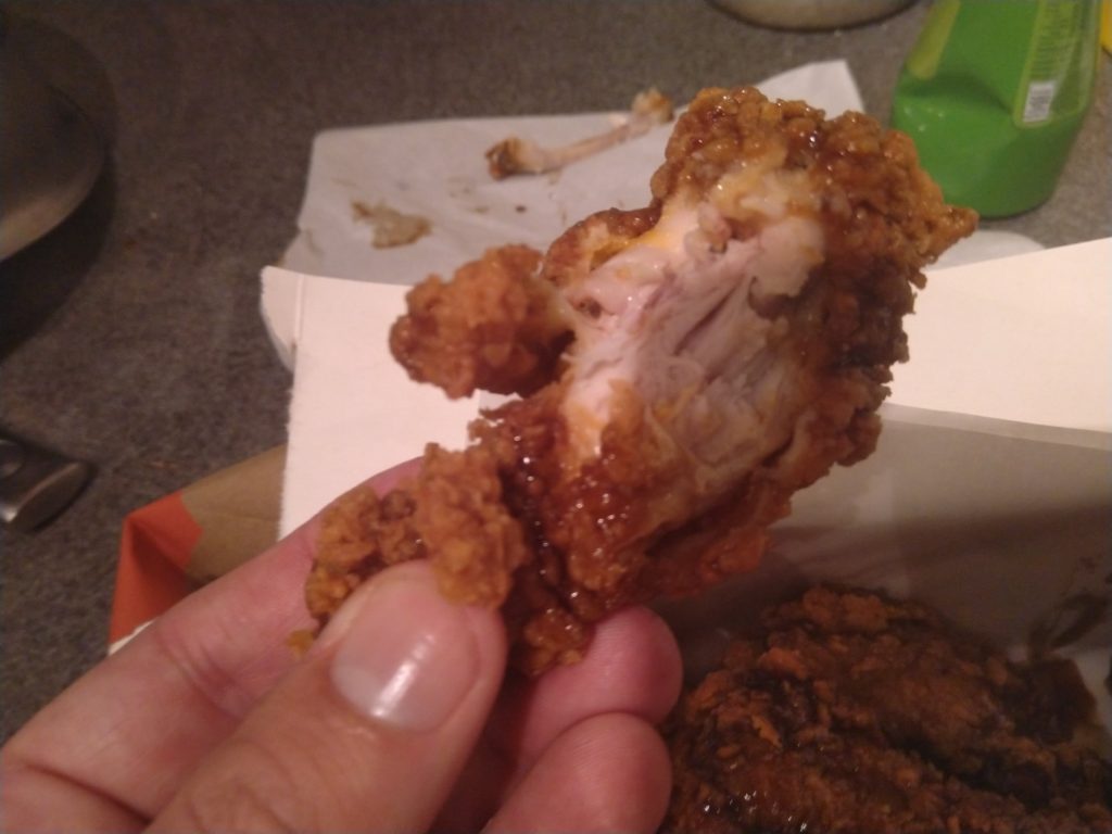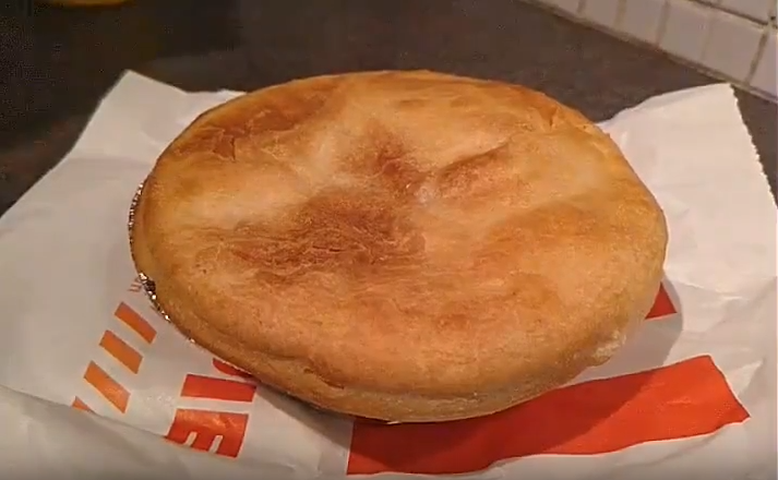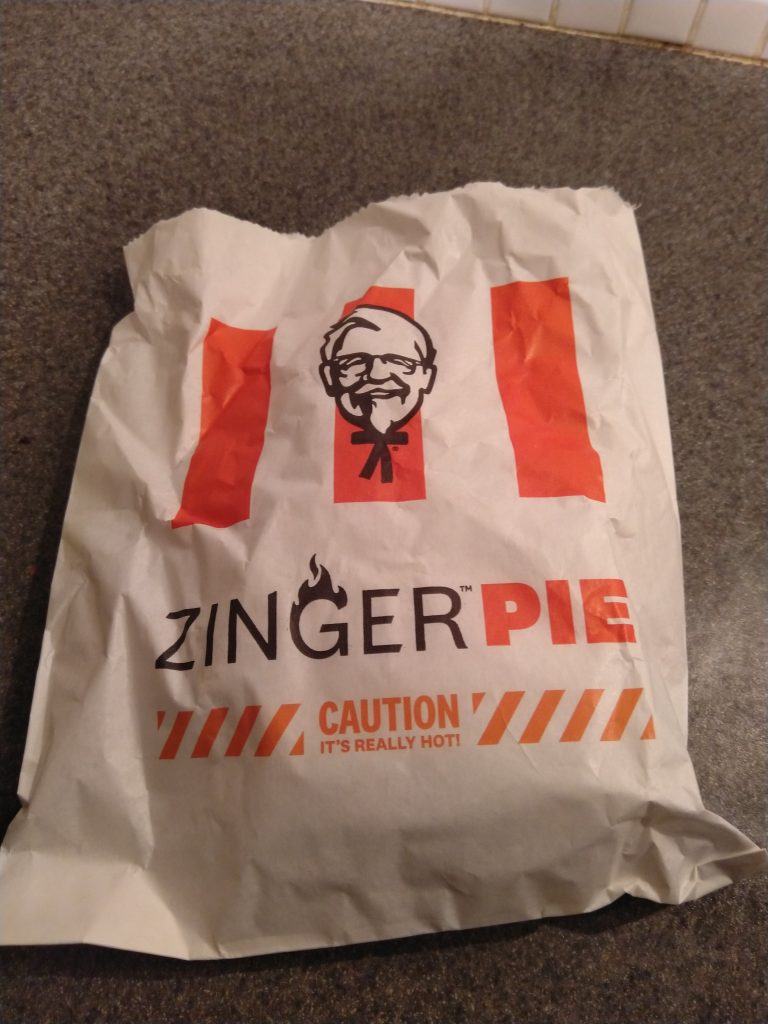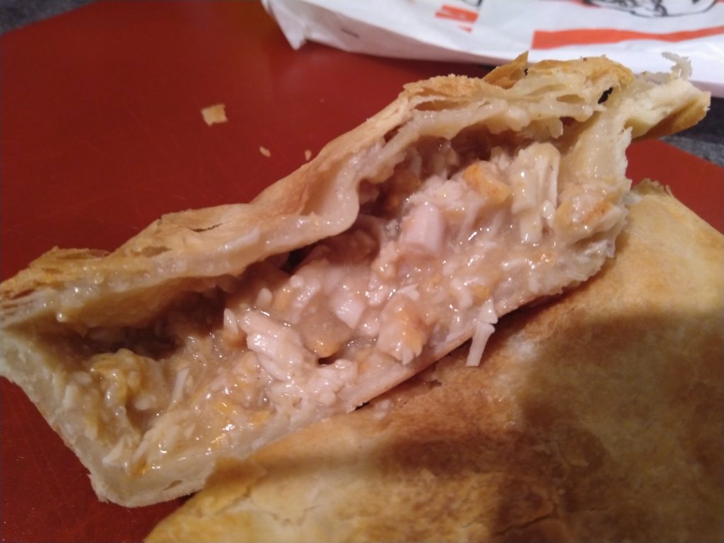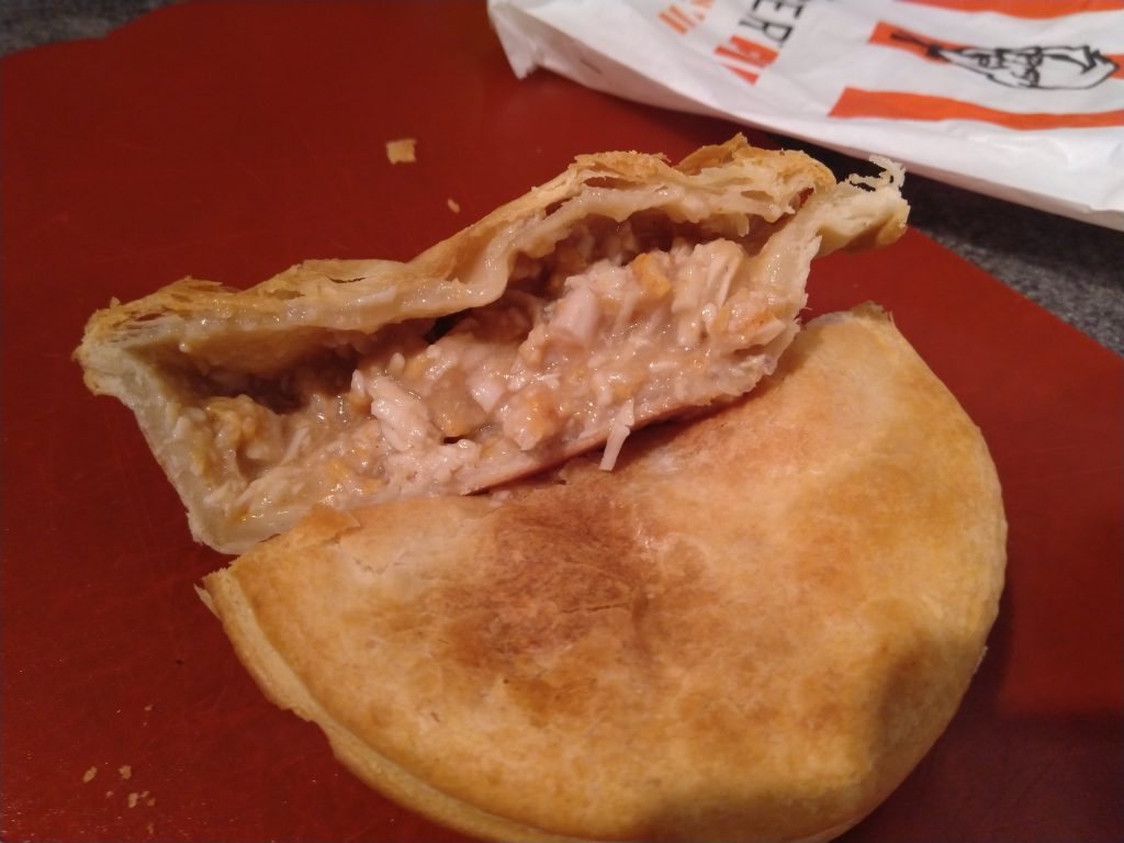 This is definitely a chicken pie, so much so that it doesn’t do anything else but be chicken and pie crust. Well, except for the mild heat from some chili source. The gravy needs more flavour. It should be the standard KFC gravy, thats more salty than this. The heat isn’t bad, its mild but noticeable and consistent.
