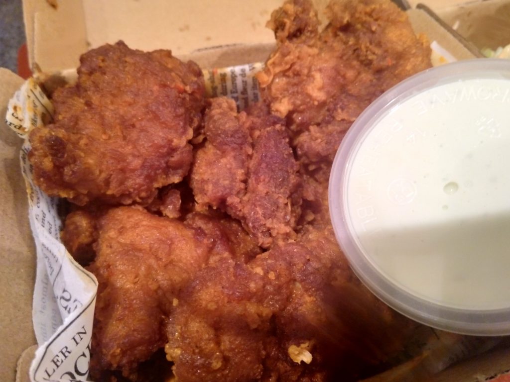 I got the Chicken Royal burger (buttermilk fried chicken, fancy sauce, remoulade sauce, lettuce and tomato) and 4x of the Buttermilk fried thigh pieces dirty style (coated in hot sauce, these also came with a jalapeno blue cheese dipping sauce.)