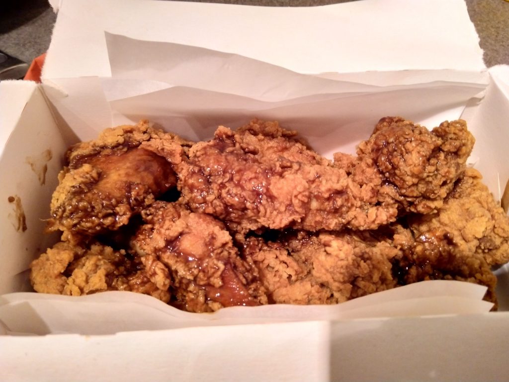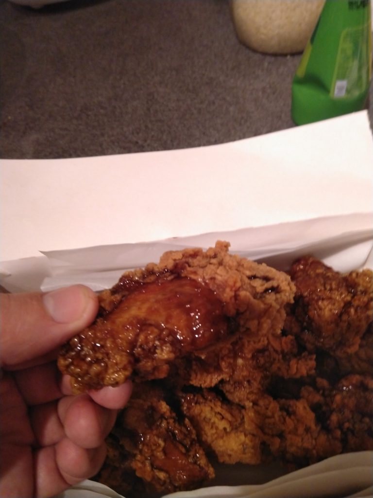 Its actually pretty good. Its Sweet, a little bit like plum sauce, has a “cola” kind of flavour, it mixes well with the spicey wings. Would be nice if there was more of it on the chicken pieces, or if it was sold individually so you could add more yourself. I like it.