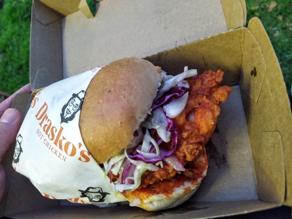 This was really good. Their Signature “sando”. Nashville Hot Chicken style, really crunchy deep fried coating, dipped or covered some how in a cayenne hot sauce, salty vinegary, mild heat (I chose medium). Well cooked chicken, not dry at all. Vinegary coleslaw, nice crunchy pickles. Only issue is its pricey. Also the bun should have been toasted. Will eat it again.